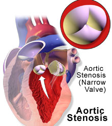 Aortic Stenosis is narrowing of the aortic valve that restricts the flow of BLOOD from the heart’s left ventricle to the AORTA. Aortic stenosis may be congenital or acquired; in either, it tends to show symptoms later in life. Acquired aortic stenosis develops as a consequence of calcium and arterial plaque deposits that infiltrate the aortic valve. Untreated aortic stenosis results in left ventricular hypertrophy (enlargement of the left ventricle), diminished CARDIAC OUTPUT, and ultimately congestive HEART FAILURE.